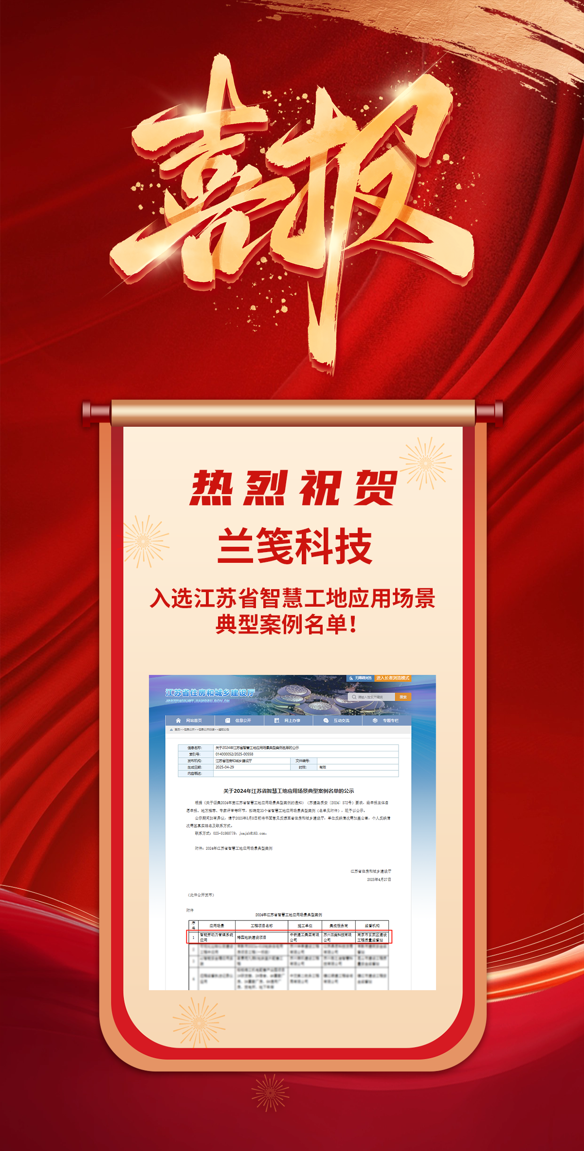 喜報(bào)!熱烈祝賀蘭箋科技入選江蘇省智慧工地應(yīng)用場景典型案例名單!